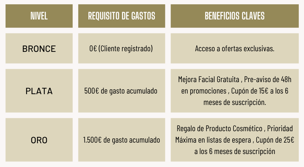 Tu participación se basa en niveles (Bronce, Plata, Oro) que se asignan según tu inversión acumulada en la clínica y en la web durante los últimos 12 meses. Ascender de nivel te permite desbloquear un universo de privilegios, regalos y atención prioritaria.